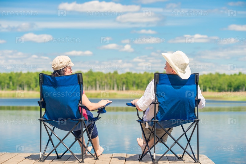 Вид с задней части пары на стульях расслабляется возле озера на деревянном пирсе