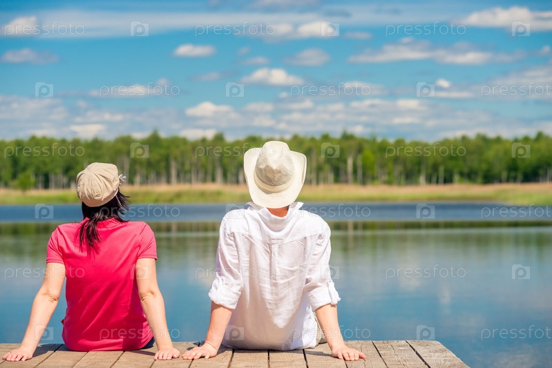 Любящая пара наслаждается красивым озером, сидя на деревянном пирсе