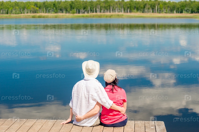 Молодая счастливая пара обнимается и наслаждается отдыхом возле красивого озера, вид сзади