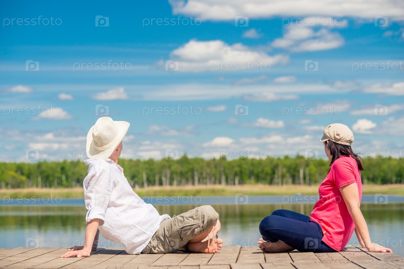 Мужчина и женщина на деревянном пирсе сидят и восхищаются красивым озером