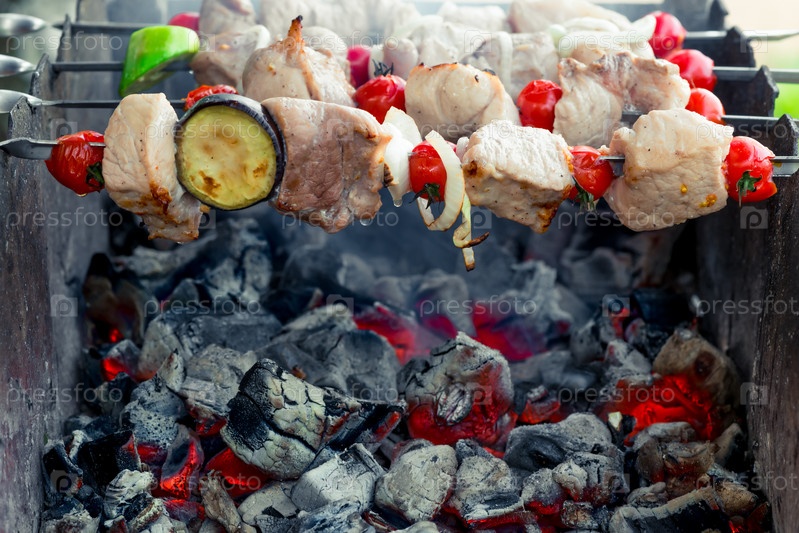 Сочный вкусный шиш-кебаб на косточках на гриле над углями