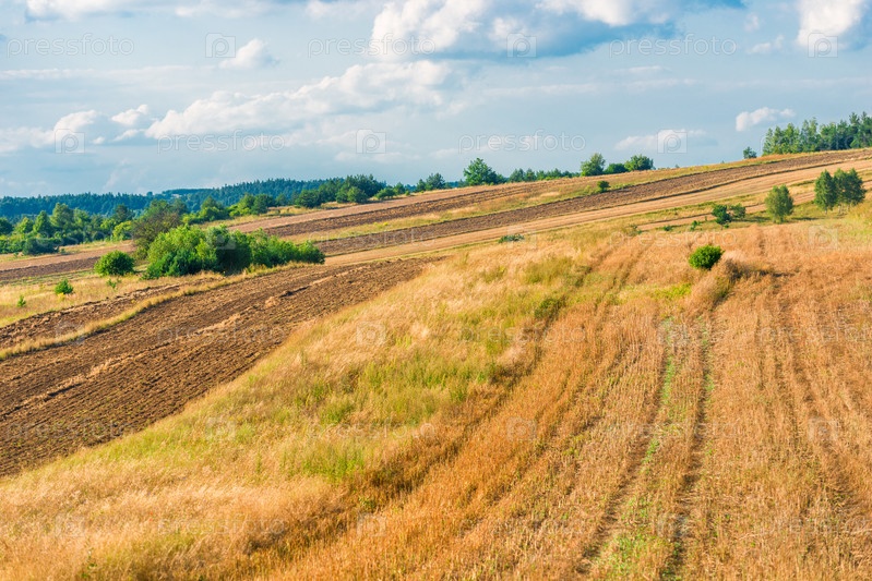 Прекрасный пейзаж - желтое пустое поле в конце лета после сбора урожая
