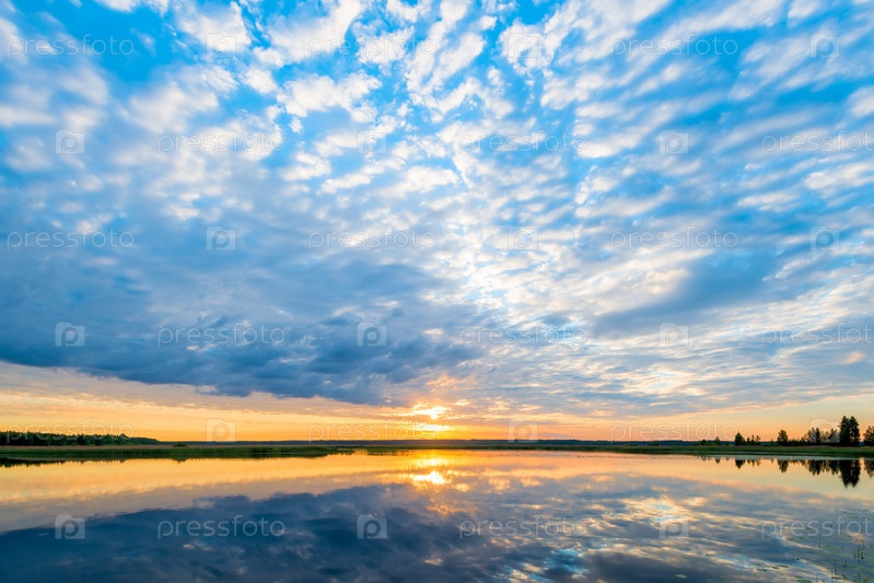 Красивые облака над живописным озером, оранжевое солнце на рассвете