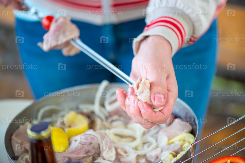 Близкий план руки, готовя вкусный шиш-кебаб