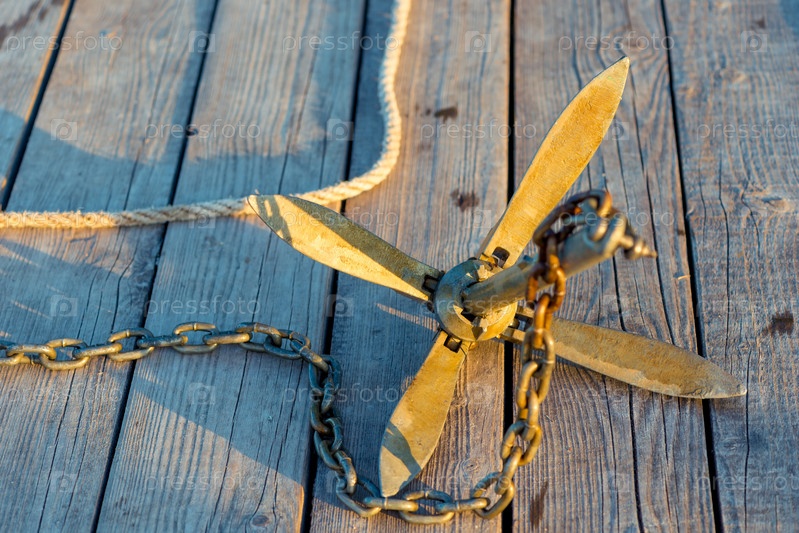 Близкий план якоря с цепью в лучах утреннего солнца лежит на деревянном пирсе