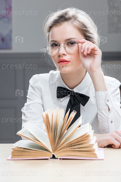 Очаровательная успешная девушка в очках с книгой за столом сидит