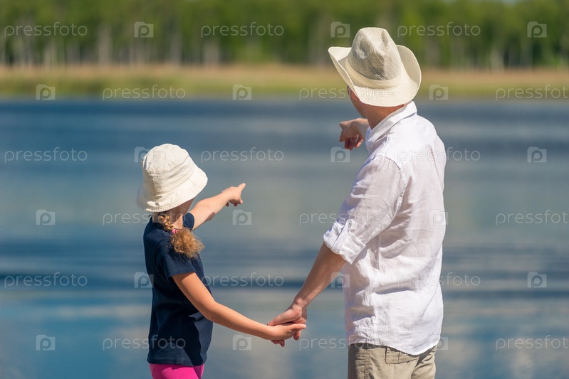 Отец и дочь на пирсе возле пруда показывают воду пальцем