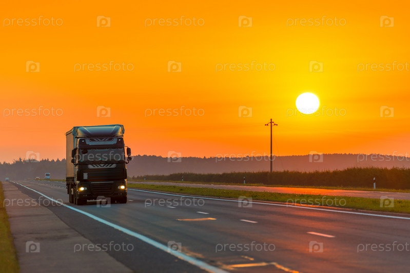 Грузовик на шоссе в лучах восходящего солнца на рассвете