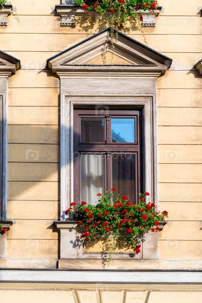 Деревянное окно дома с красивыми красными цветами в горшке