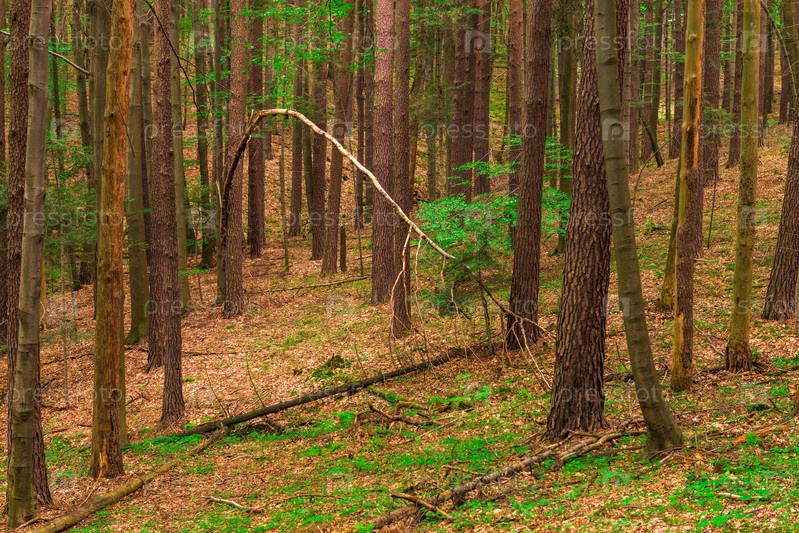 Стволы высоких деревьев в смешанном лесу