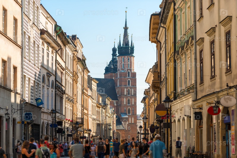 Толпа туристов на улице Флориана, вид на Мариинскую церковь в центре Кракова, Польша