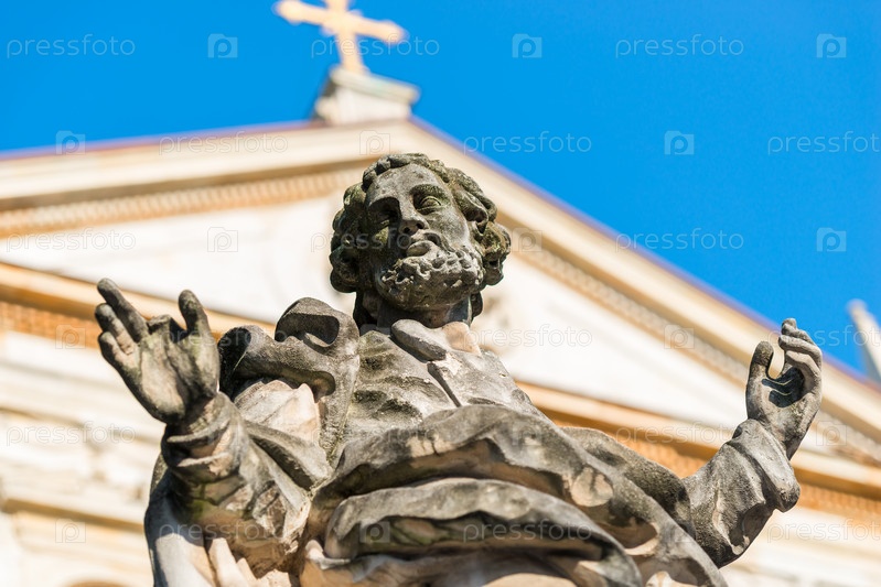 Скульптура апостола на фоне католической церкви в Кракове
