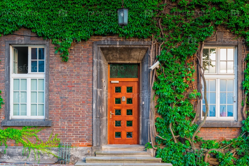 Деревянная дверь и два окна здания, покрытые красивым плющом