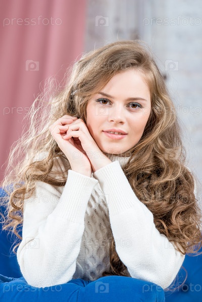 Улыбающаяся женщина с длинными локонами позирует в помещении