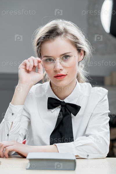 Вертикальный портрет красивой девушки в стильных очках, сидящей за столом