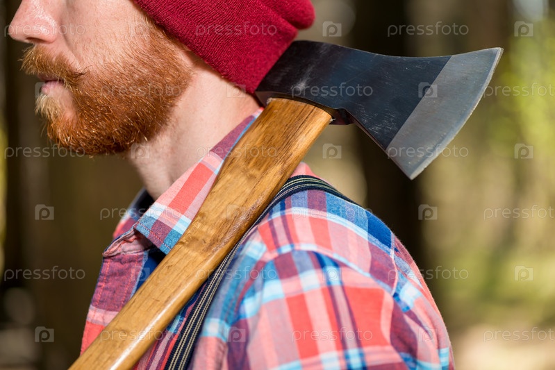 Топор на плече бородатого лесничего в ближайшем плане