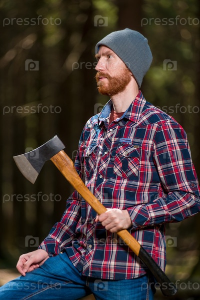 Вертикальный портрет лесоруба с топором в летнем лесу