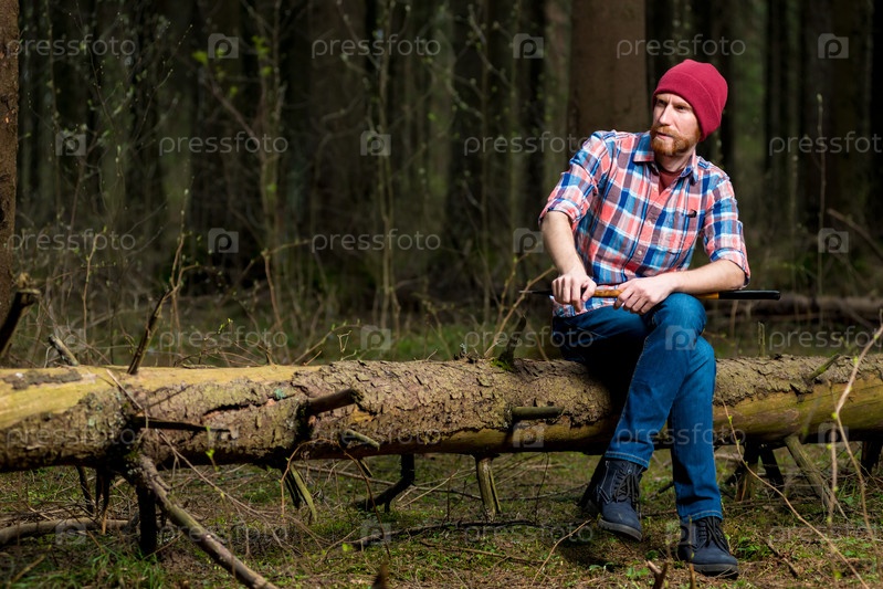 Задумчивый лесничий с бородой, отдыхающий на упавшем дереве в лесу