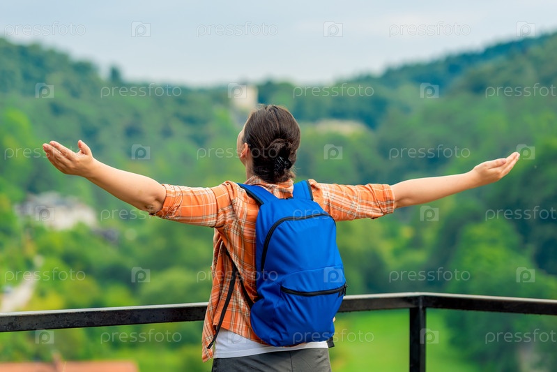 Женщина-туристка с распростертыми руками наслаждается свободой в природе