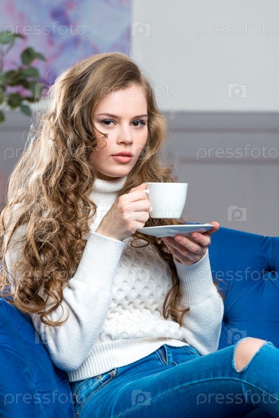 Вертикальный портрет красивой молодой женщины с чашечкой кофе на диване