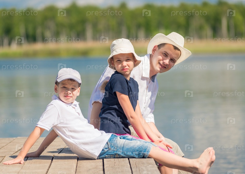 Счастливая семья отдыхает на деревянном пирсе возле озера