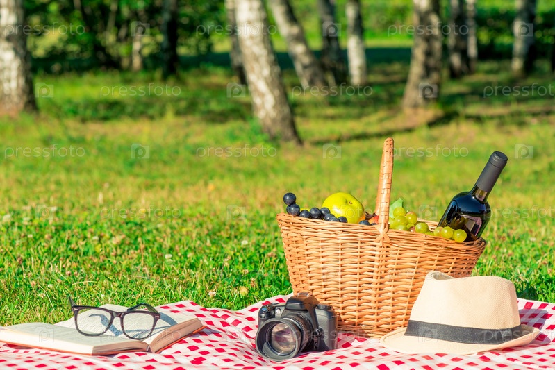 Романтический пикник для влюбленных - корзина с вином и фруктами на скамеечке в парке