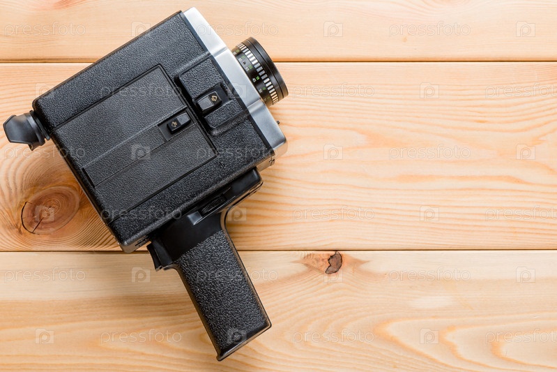 Винтажный видеокамер опирается на легкие деревянные доски, пространство справа