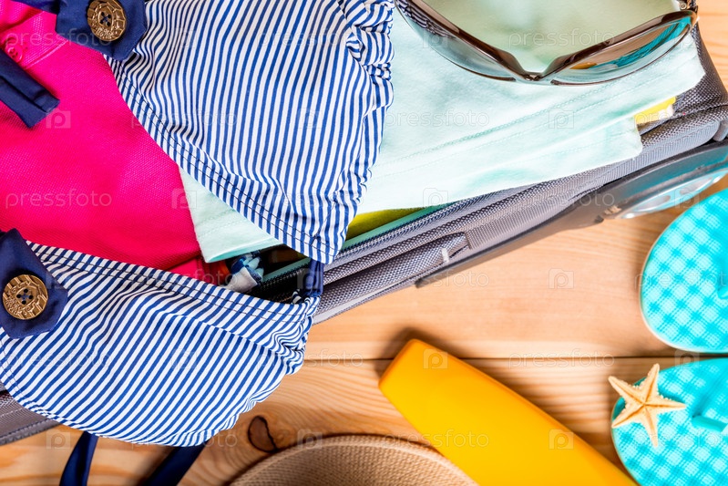 Близкий взгляд сверху на вещи в чемодане, готовом к путешествию