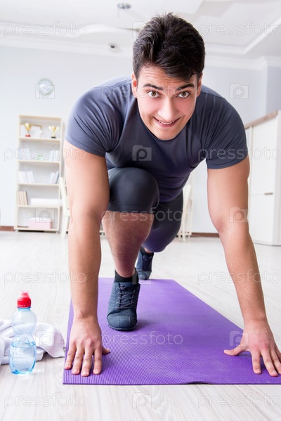 Молодой человек тренируется дома в спорте и здоровом образе жизни с