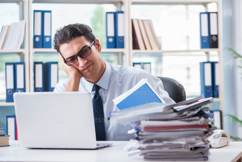 Бизнесмен с чрезмерной рабочей бумажной работой, работающий в офисе