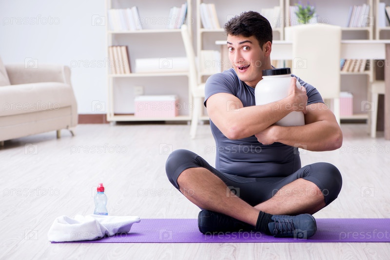 Мужчина с пищевыми добавками в спорте и концепции здорового образа жизни