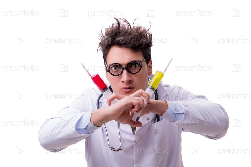 Забавный доктор со шприцем, изолированным на белом