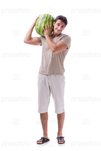 Молодой человек с арбузом, изолированным на белом