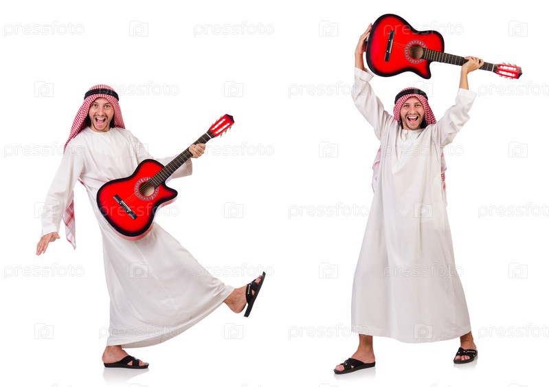 Арабский мужчина, играющий на гитаре изолированный на белом