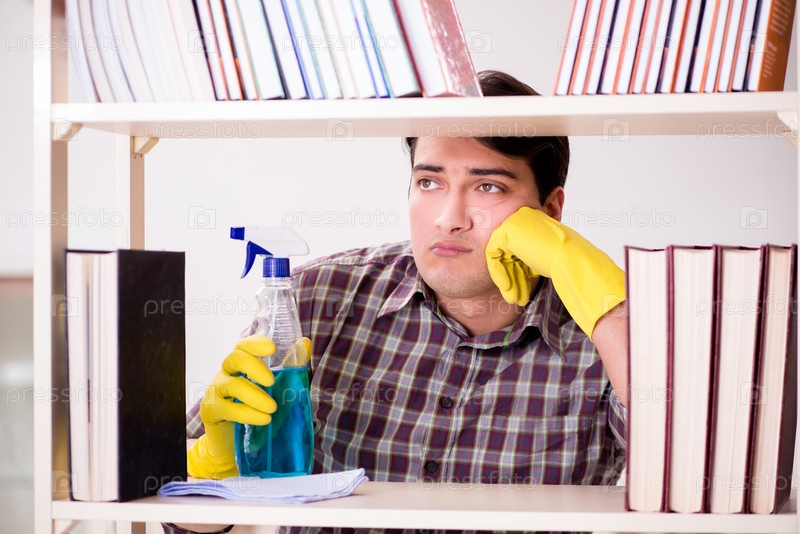 Мужчина очищает пыль с книжной полки