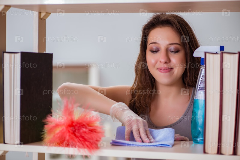 Женщина очищает пыль с книжной полки