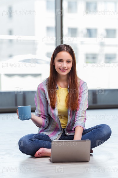 Молодая девушка серфирует в интернете на ноутбуке