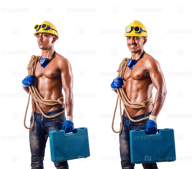 Мышечный строитель с инструментами, изолированными на белом