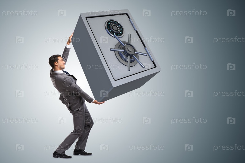 Бизнесмен, несущий металлический сейф в концепции безопасности