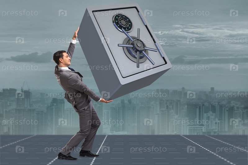 Бизнесмен, несущий металлический сейф в концепции безопасности