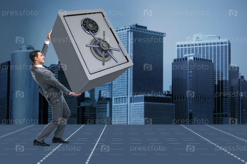 Бизнесмен, несущий металлический сейф в концепции безопасности