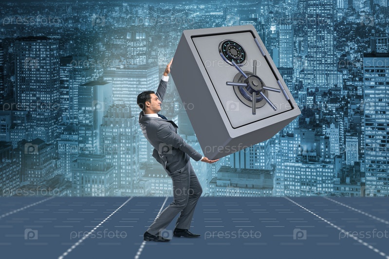 Бизнесмен, несущий металлический сейф в концепции безопасности
