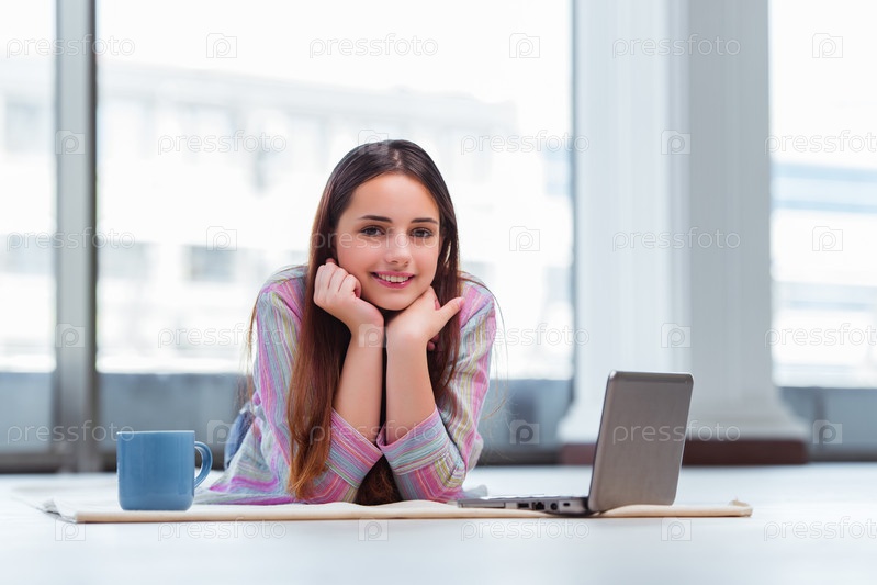 Молодая девушка серфирует в интернете на ноутбуке