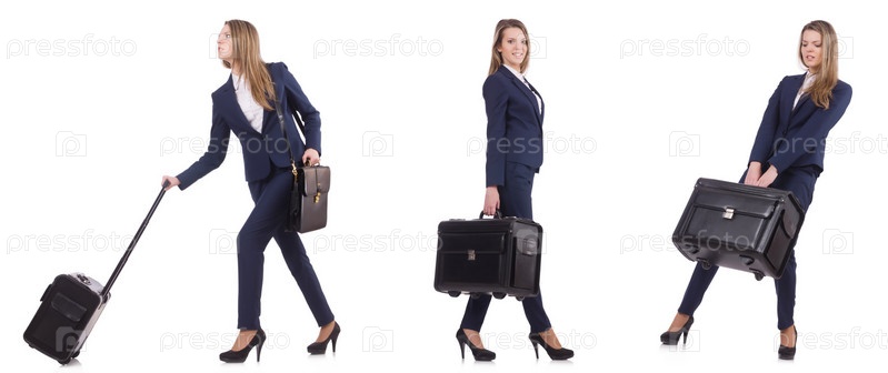Молодая бизнес-женщина с чемоданом изолирована на белом