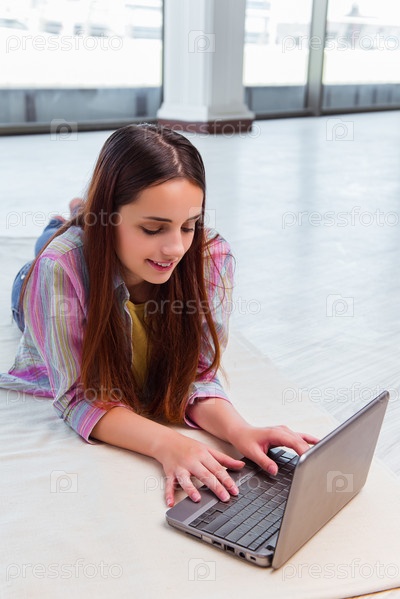 Молодая девушка серфирует в интернете на ноутбуке