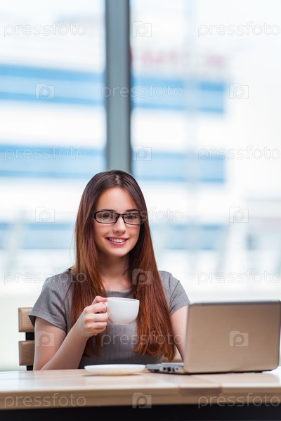 Молодая бизнесвуменка пьет чай в офисе