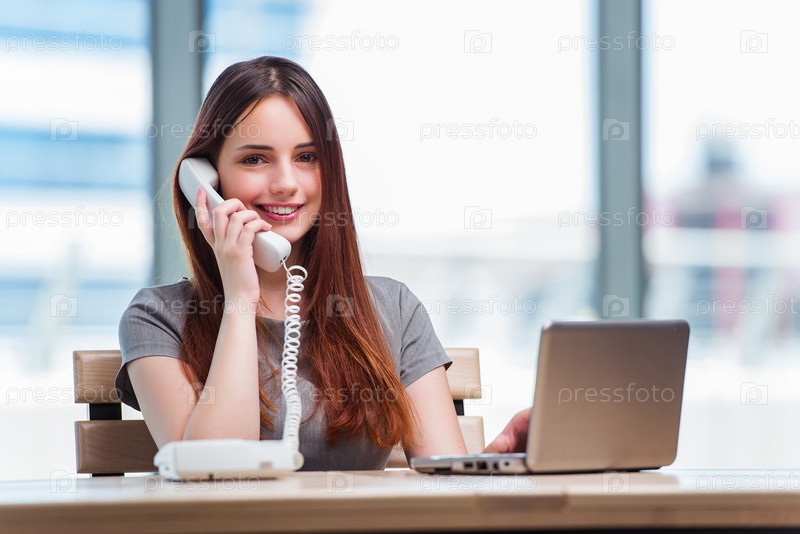 Молодая женщина разговаривает по телефону в офисе