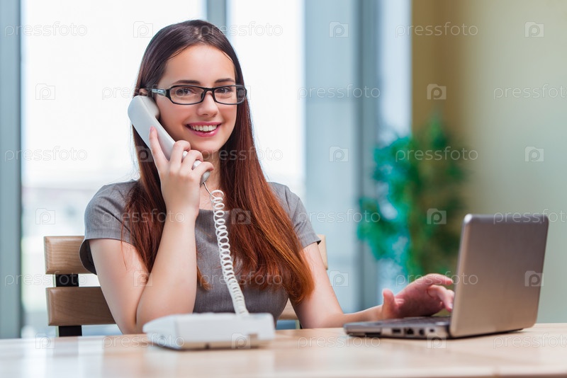 Молодая женщина разговаривает по телефону в офисе