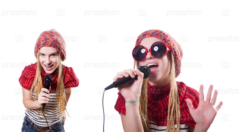 Молодая певица с микрофоном на белом