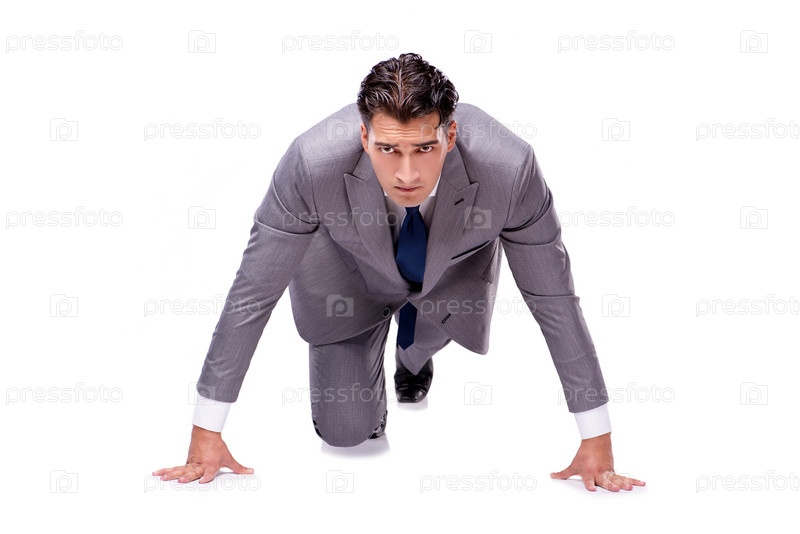 Бизнесмен на старте готов к бегу изолированный на белом